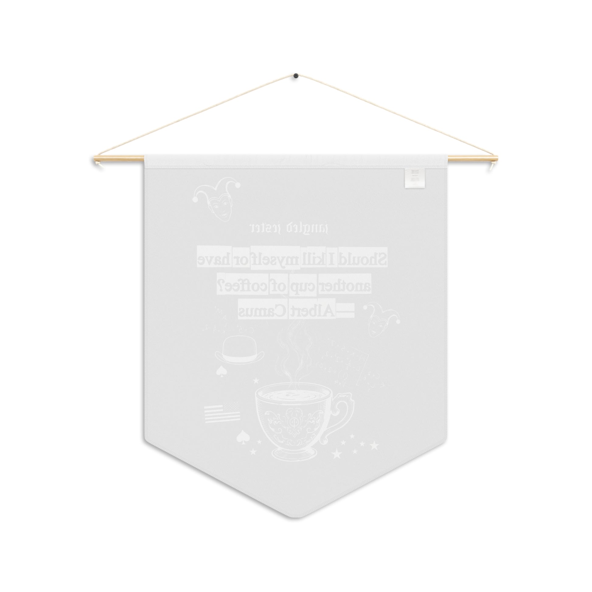 “Should I kill myself, or have a cup of coffee? But in the end one needs more courage to live than to kill himself.” ― Albert Camus. Camus wrote extensively on the problem of suicide. May this pennant be your reminder to live, sip, endure. 100% polyester. Wooden down and twine frame included, hang it anywhere.