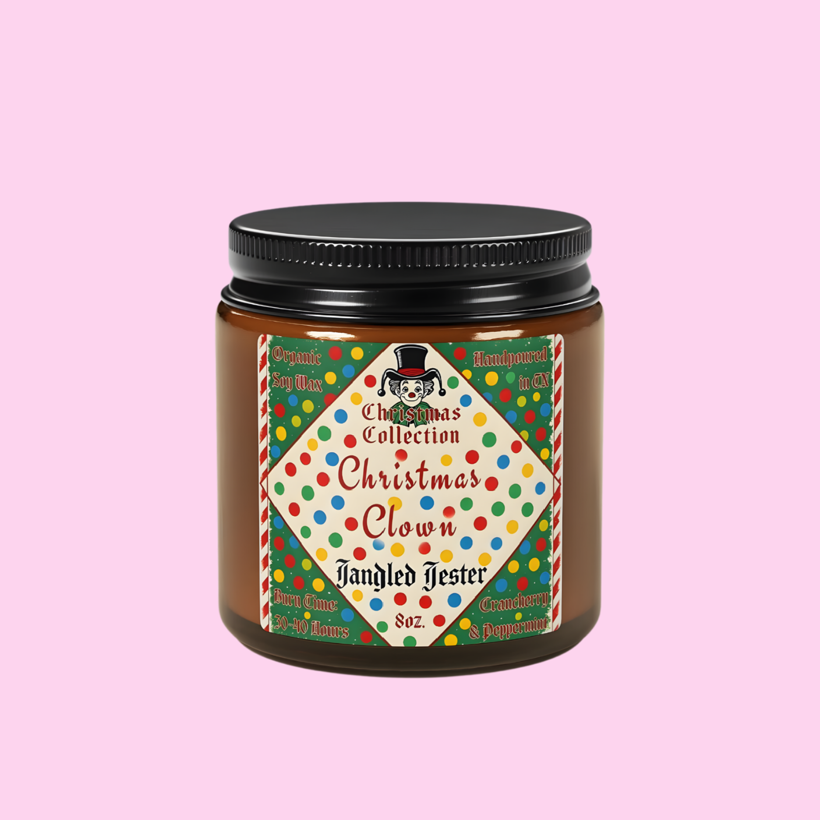 Infused with a merry blend of tart crancherry and fresh peppermint. Organic soy wax poured into an 8 oz amber glass jar, 30-40 hours of cozy burn time. Handcrafted with love in Tennessee.