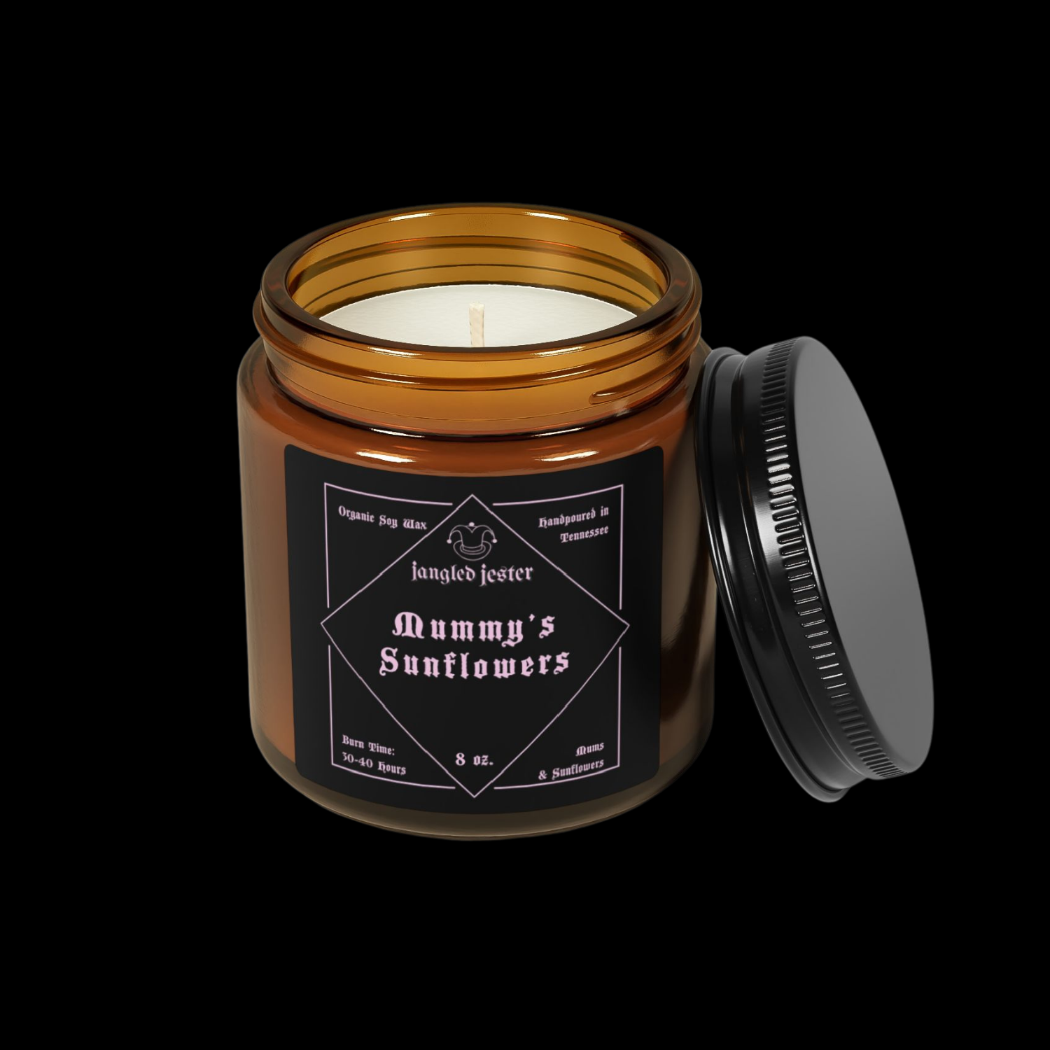 - Container: Glass amber jar with black lid