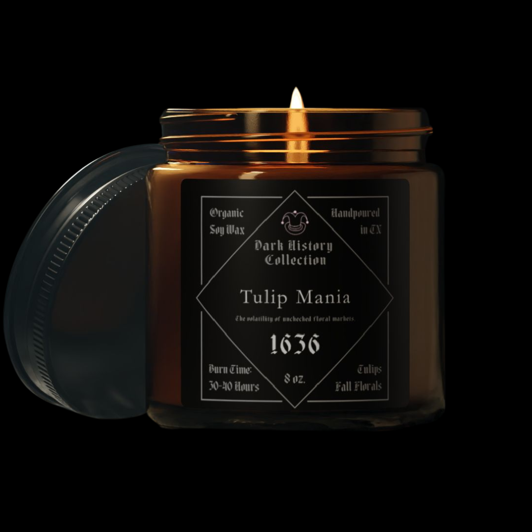 This candle draws from the 17th-century Dutch tulip economic bubble and features a scent of tulips and fall florals. It comes in an 8 oz amber glass jar with a 30-40 hour burn time and is made in Tennessee.